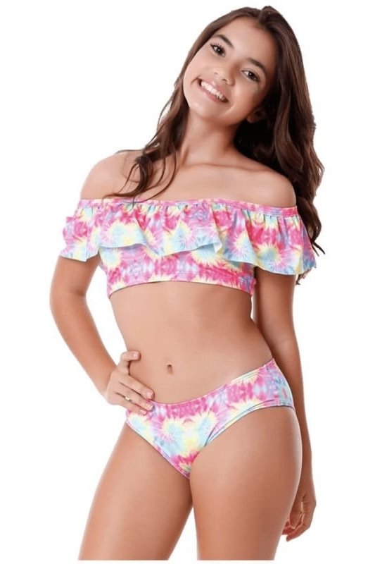 Biquíni top ciganinha com babado e calcinha estampados.