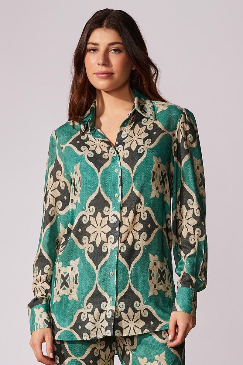 Camisa estampada trabalhada em tecido com textura. O modelo possui mangas longas e fechamento em botões de madrepérola.