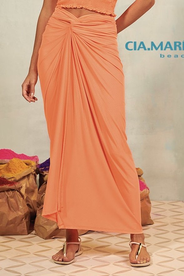 Canga lisa, pode ser amarrada de diversas formas na cintura, como saia com amarração lateral e fenda, ou saia midi reta com amarração traseira.