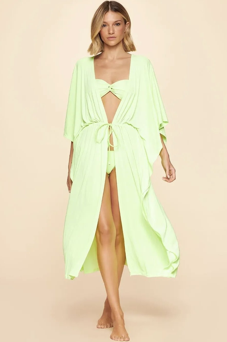 Kaftan longo liso. Possui abertura na frente, amarração na cintura e detalhe de ponteiras de metal. Ótima opção para saída de banho, praia ou piscina. Compõe looks resort e loungewear.