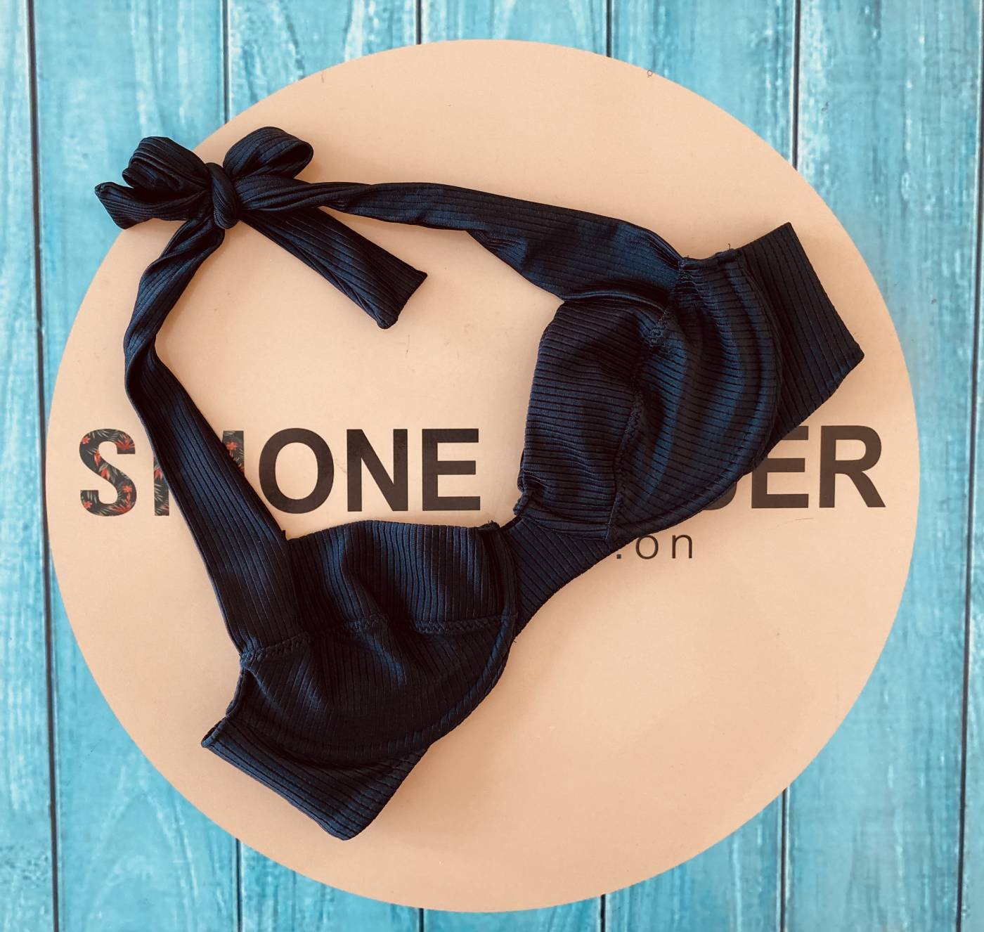Top liso modelo meia taça. Sem bojo, com aro e com amarração nas costas.