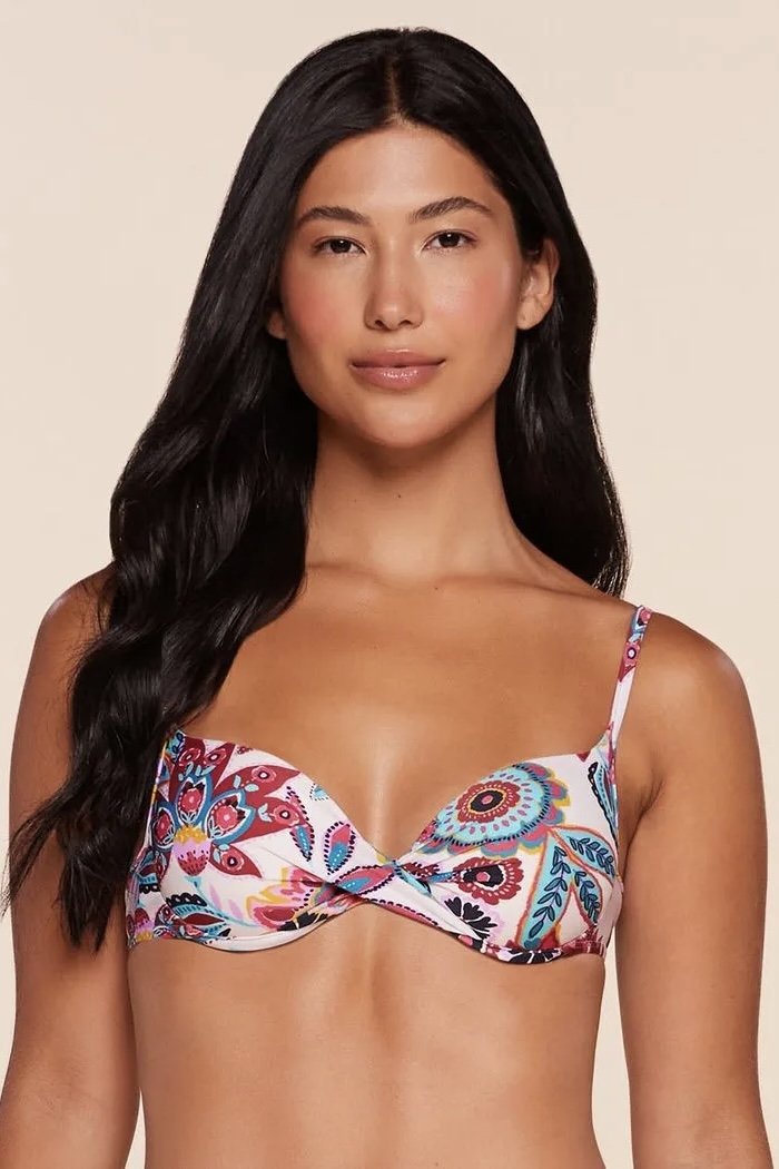 Top meia taça estampado. O modelo bojo fixo, aro para maior sustentação, decote transpassado, alças fixas com regulagem e amarração nas costas.